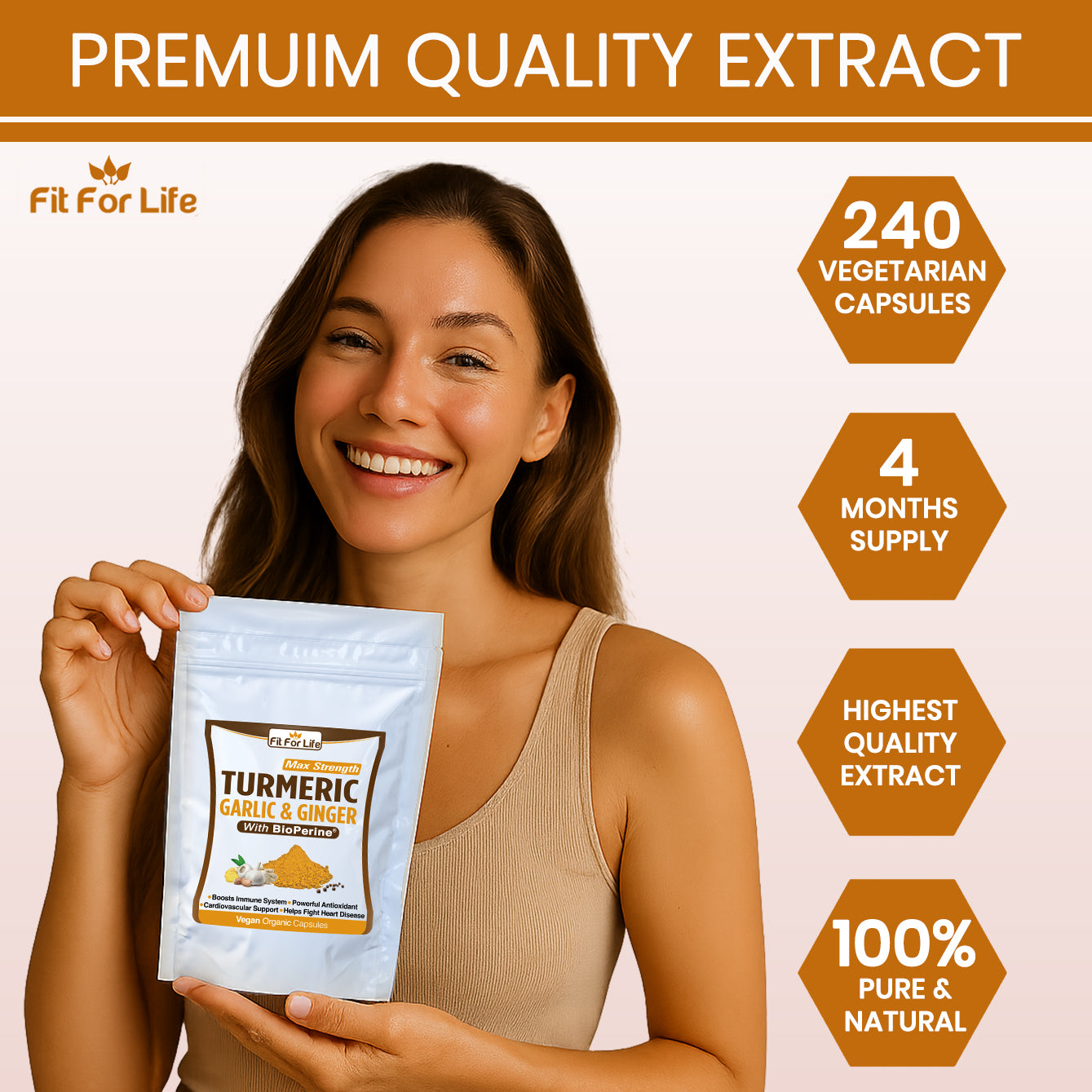 Garlic: strengthens the functions of the immune system. Ginger: aids digestion, reduces nausea and may fight flu and colds. Turmeric: loaded with antioxidants and anti-inflammatory properties. Black Pepper: helps activate the curcumin, the active ingredient in turmeric.