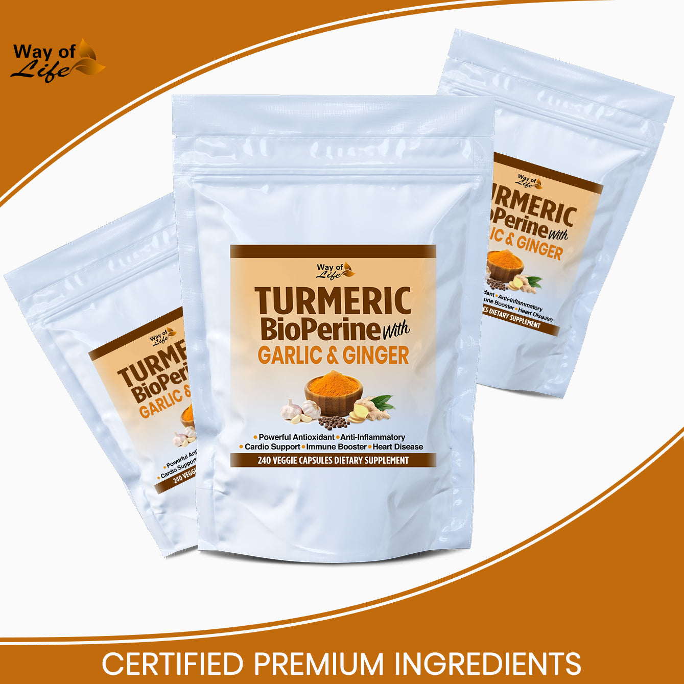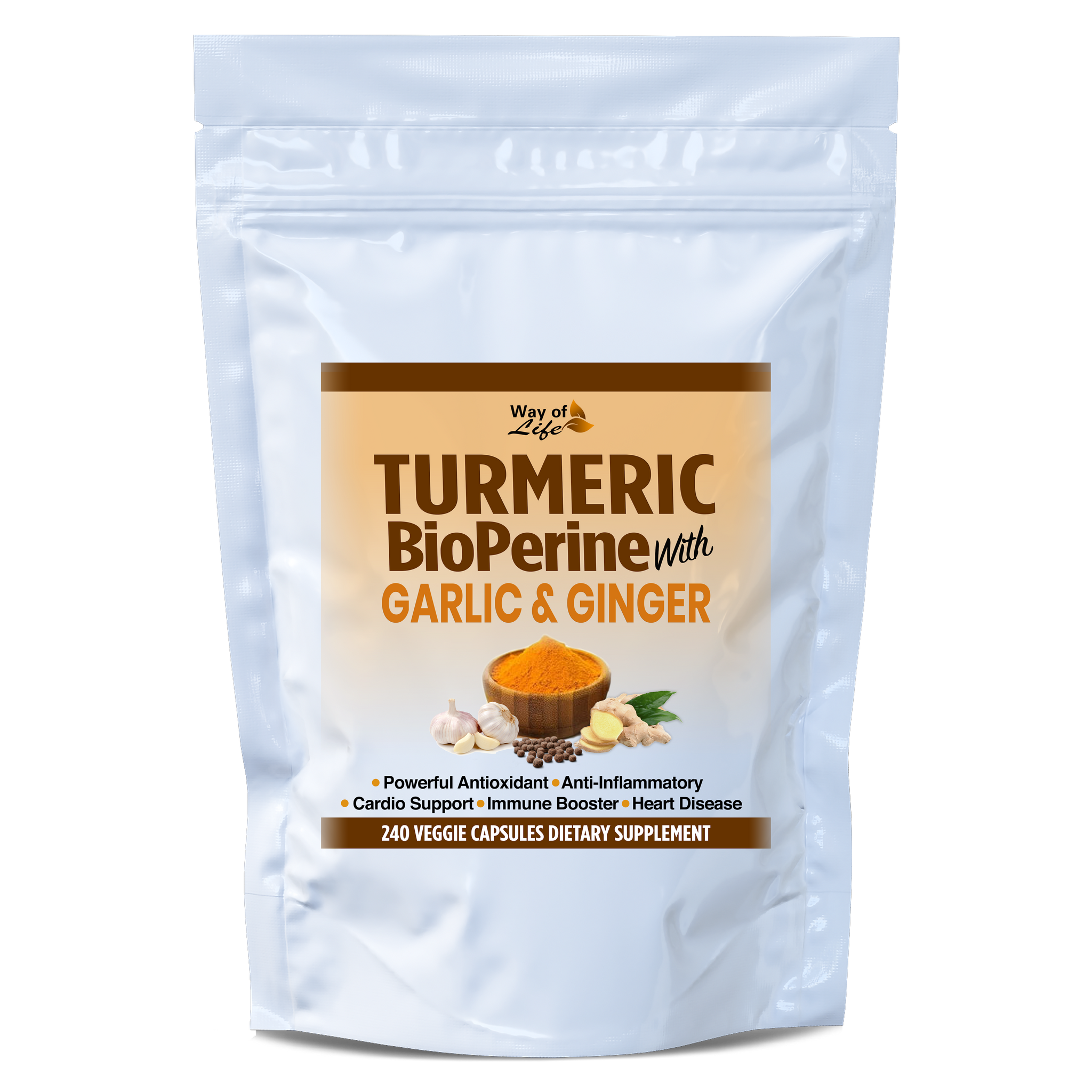 Garlic: strengthens the functions of the immune system. Ginger: aids digestion, reduces nausea and may fight flu and colds. Turmeric: loaded with antioxidants and anti-inflammatory properties. Black Pepper: helps activate the curcumin, the active ingredient in turmeric.